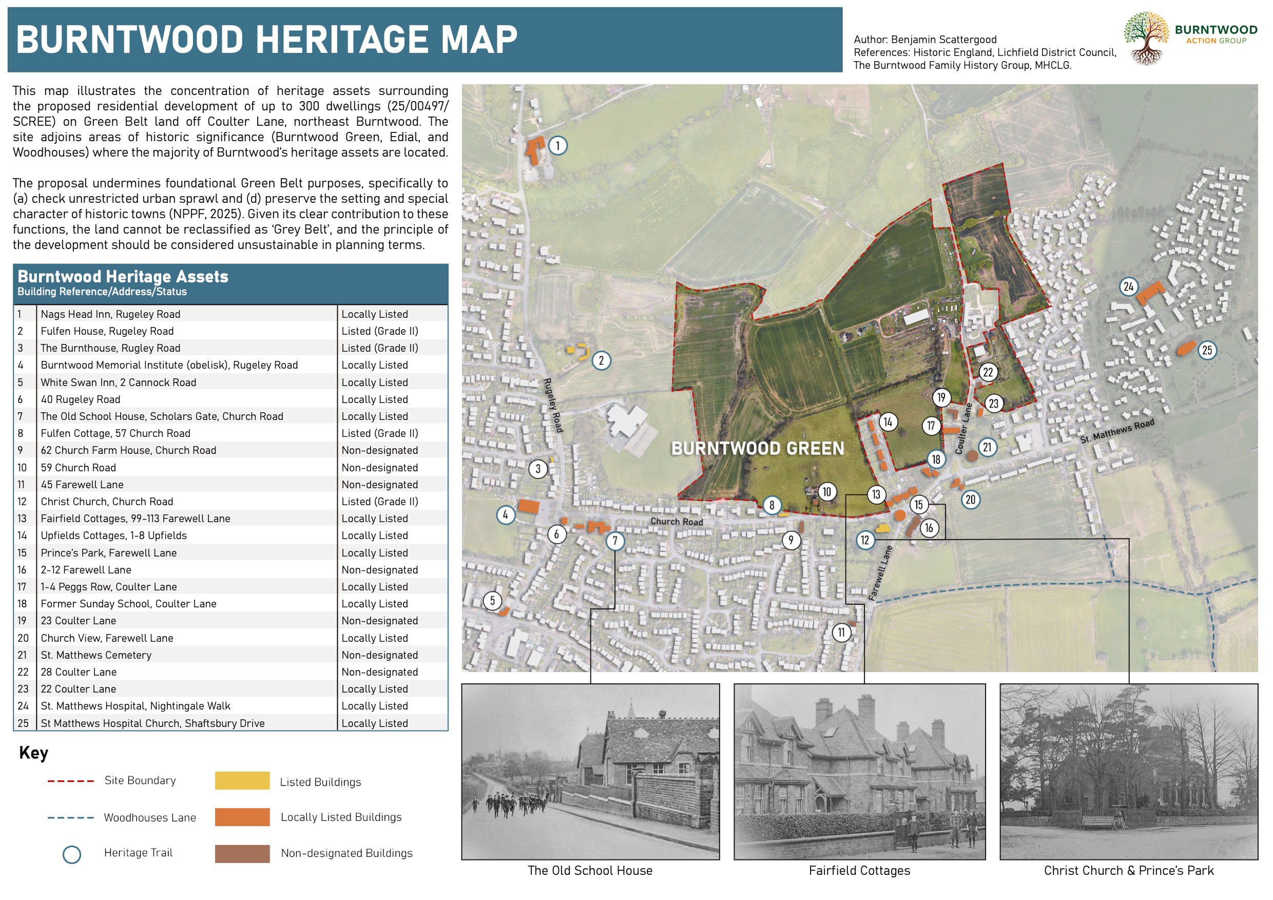 The map in the picture shows the concentration of heritage assets surrounding the proposed 300-home Bloor’s development on Green Fields on our Green Belt land next to Church Road/ Coulter Lane. The 300-home site is right next to historically significant areas like Burntwood Green and Edial, where most of the town’s heritage assets are located. … Continue reading Will developers try to ignore the significance of our historic assets?